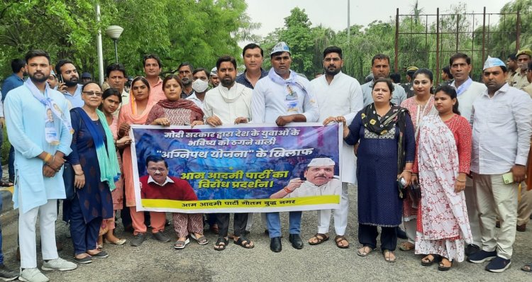 केन्द्र सरकार द्वारा भारतीय सेना में 4 साल के लिए सैनिकों की भर्ती के लिए लायी गयी अग्निपथ योजना के खिलाफ आम आदमी पार्टी के कार्यकर्ताओं ने जिला मुख्यालय ग्रेटर नोएडा पर विरोध प्रदर्शन किया।