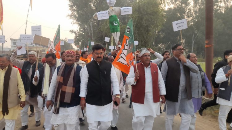 प्रधानमंत्री नरेन्द्र मोदी के खिलाफ वृहस्पतिवार को पाकिस्तानी विदेश मंत्री विलावल भुट्टो ने शर्मनाक और आपत्तिजनक जो टिप्पणी किया है उसको लेकर आज सायंकाल भाजपा कार्यालय छावनी लाइन से सैकड़ों से ज्यादा भाजपा नेताओं और कार्यकर्ताओं ने जिलाध्यक्ष भानुप्रताप सिंह,जिला प्रभारी अशोक मिश्रा,क्षेत्रीय उपाध्यक्ष सरोज कुशवाहा, कृष्ण बिहारी राय,प्रभुनाथ चौहान आदि वरिष्ठ नेताओं के नेतृत्व मे जुलूस के रुप मे हाथों मे पाकिस्तान तथा पाक विदेश मंत्री विरोधी नारों लिखी तख्तियां हाथों मे लेकर नारे लगाते हुए भुतहियाटाड़ चौराहे पहुंच कर विलावल भुटटो का पुतला जलाया।