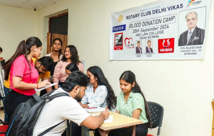 नोएडा। आईएमएस लॉ कॉलेज नोएडा में रक्तदान शिविर का आयोजन हुआ। शुक्रवार को सेक्टर 62 स्थित संस्थान परिसर में आयोजित कार्यक्रम के दौरान छात्रों ने रोटरी क्लब दिल्ली विकास के लिए रक्तदान कर समाज कार्य में अपनी भागीदारी निभाई। वहीं शिविर के दौरान संस्थान के विद्यार्थियों ने 65 यूनिट रक्तदान किया।