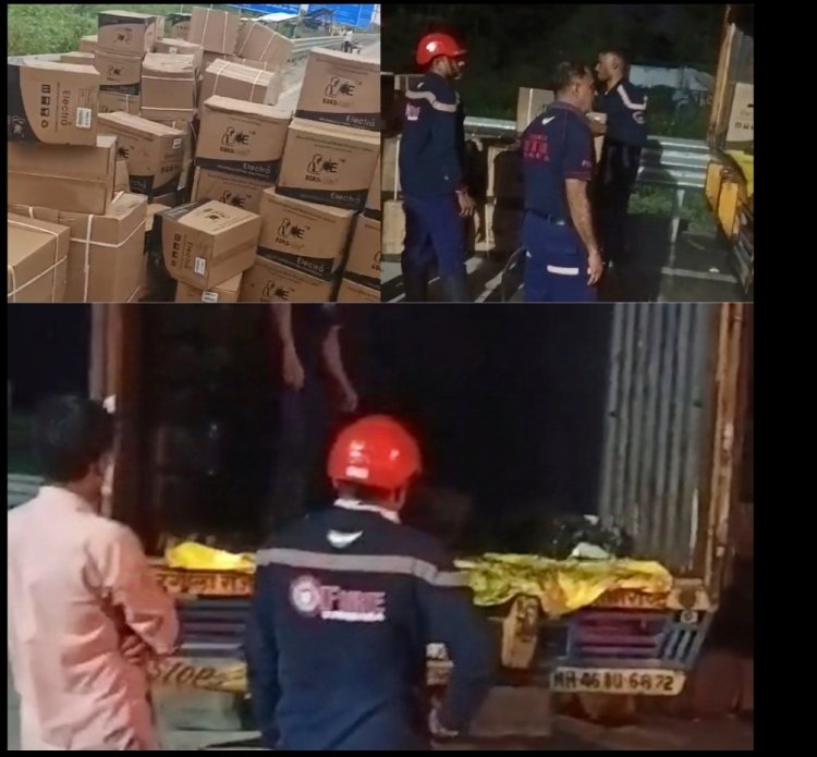 दिल्ली मुंबई एक्सप्रेस पर कंटेनर में लगी आग, कोको टावा कंपनी का लाखों का माल जलकर खाक