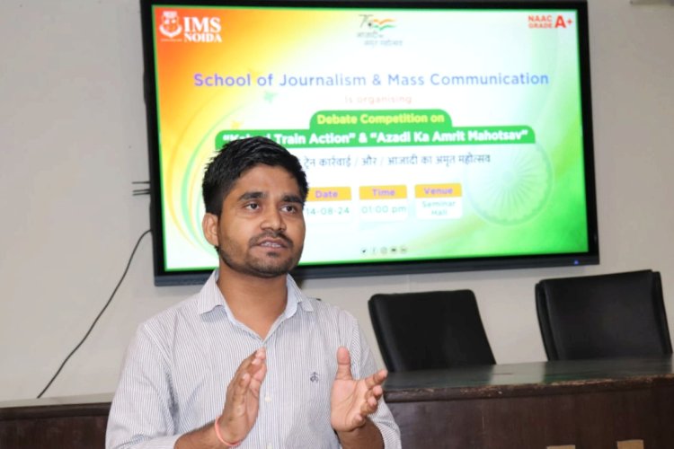 नोएडा। इंस्टीट्यूट ऑफ मैनेजमेंट स्टडीज (आईएमएस) नोएडा में हर घर तिरंगा एवं काकोरी ट्रेन एक्शन पर वाद-विवाद प्रतियोगिता का आयोजन हुआ। बुधवार को सेक्टर 62 स्थित संस्थान परिसर में आयोजित कार्यक्रम के दौरान जनसंचार के छात्रों ने आजादी के महानायकों को याद करते हुए अपने-अपने विचार व्यक्त किए। वहीं कार्यक्रम के दौरान छात्रों को फिल्म दिखाकर काकोरी ट्रेन एक्शन विषय पर विस्तृत जानकारी दी गयी।