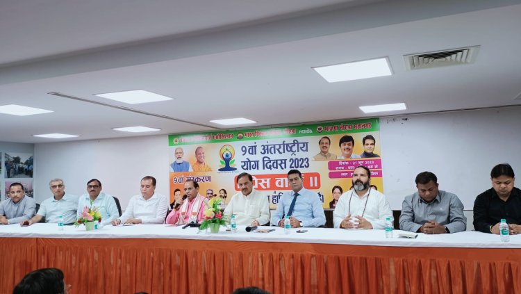 नोएडा। सेक्टर 6 स्थित एनईए भवन में नौएडा एन्ट्रेप्रिनियोर्स एसोसिएशन, भारत विकास परिषद, भारतीय जनता पार्टी, नौएडा महानगर एंव नौएडा विकास प्राधिकरण द्वारा नौएडा वासियों के सहयोग से 21 जून को प्रातः 7.00 बजे से 8.00 बजे तक इन्डोर स्टेडियम, सैक्टर-21ए, नौएडा में मनाये जा रहे अर्न्तराष्ट्रीय योग दिवस के आयोजन के संबंध में विस्तृत जानकारी प्रदान करने हेतु संवाददाता सम्मेलन का आयोजन किया गया।
