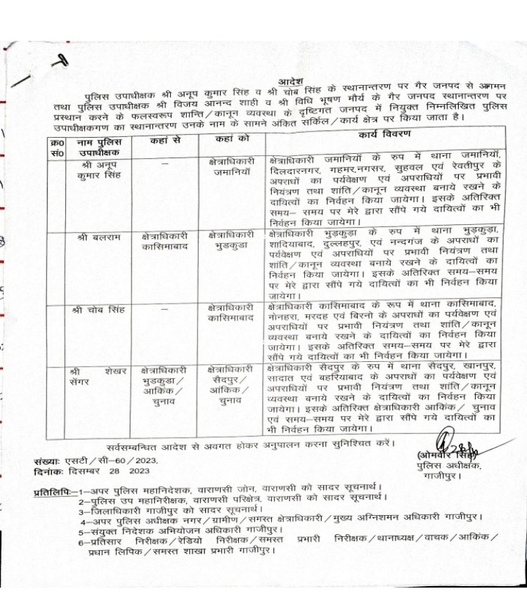 कासिमाबाद सीओ बलराम सहित चार का हुआ स्थानान्तरण