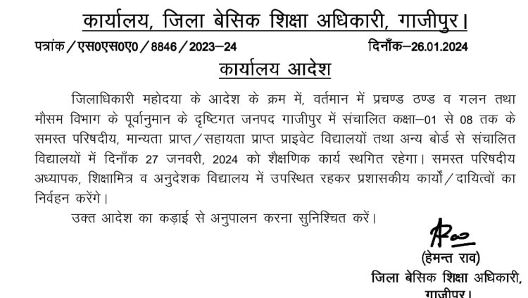 गाजीपुर जिला अधिकारी के आदेश के क्रम में इस समय चल रहे प्रचंड ठंड और गलन को देखते हुए जनपद में संचालित कक्षा 1 से 8 तक के समस्त परिषदीय मान्यता प्राप्त सहायता प्राप्त प्राइवेट विद्यालयों और अन्य बोर्ड से संचालित विद्यालयों को दिनांक 27 जनवरी को अवकास रहेगा पर समस्त परिषदीय अध्यापक शिक्षामित्र और अनुदेशक विद्यालय में उपस्थित रहकर अपने प्रशासकीय कार्यों को करेंगे ।