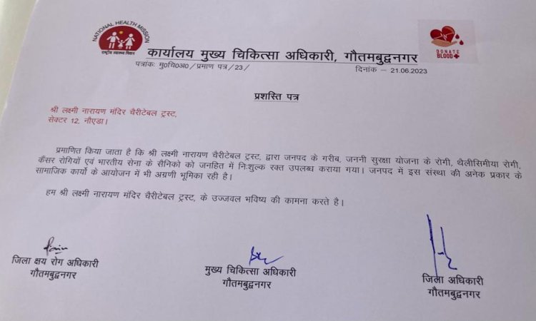 नोएडा। आज अंतर्राष्ट्रीय योग दिवस के अवसर पर गौतम बुद्ध नगर के जिला अधिकारी मनीष वर्मा द्वारा सेक्टर- 56 स्थित लक्ष्मी नारायण मंदिर को स्वास्थ्य के क्षेत्र में अथक प्रयासों के लिए सम्मानित किया गया। लक्ष्मी नारायण मंदिर द्वारा कई रक्तदान शिविरों का आयोजन कर रक्तदान के प्रयास किए गए है, जिसके परिणाम हर बार सराहनीय रहे हैं।