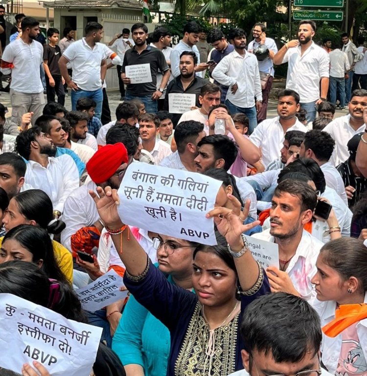 नई दिल्ली: अखिल भारतीय विद्यार्थी परिषद (अभाविप) ने पश्चिम बंगाल स्थित आरजी कर मेडिकल कॉलेज में महिला डॉक्टर के साथ यौन दुष्कर्म के बाद हत्या के मामले में शनिवार को दिल्ली स्थित बंग भवन सहित देशव्यापी प्रदर्शन कर इस मामले में न्याय की मॉंग की। पश्चिम बंगाल में घटित जघन्यतम श्रेणी के इस अपराध ने पूरे देश को झकझोर कर रख दिया है।