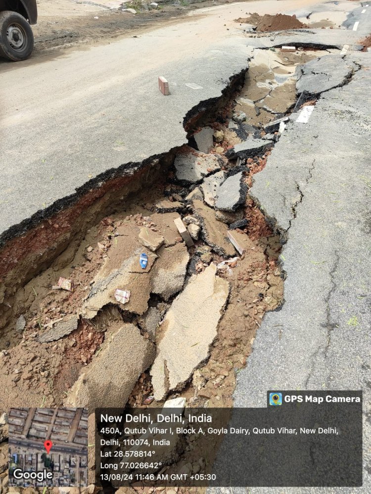 नई दिल्ली: शहर के गोयला डेयरी इलाके में पीडब्ल्यूडी द्वारा बनाई गई सड़क मात्र दो महीने के भीतर ही धंस गई जिससे निर्माण कार्य की गुणवत्ता पर गंभीर सवाल उठ रहे हैं। स्थानीय निवासियों और वाहन चालकों को इस धंसी हुई सड़क के कारण बड़ी परेशानी का सामना करना पड़ रहा है, और दुर्घटनाओं की आशंका भी बढ़ गई है।