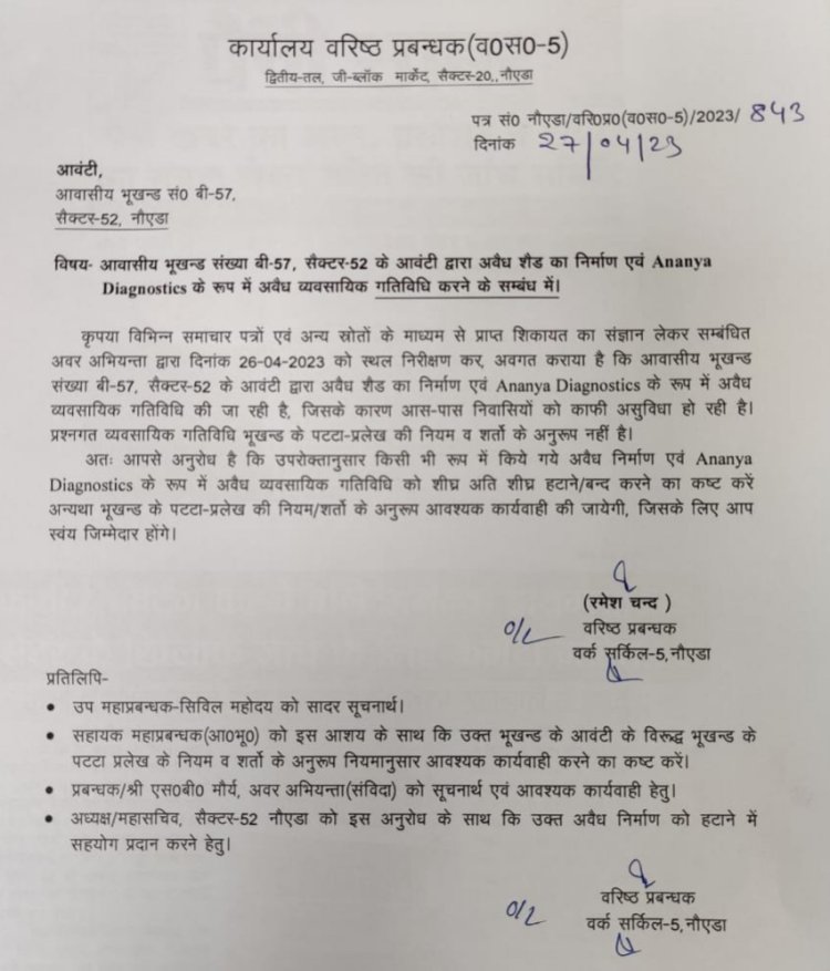 नोयडा। सेक्टर 52 स्थित आवासीय भूखंड बी 57 पर अनाया डायग्नोसिस सेंटर व टिन शेड डाल कर अवैध व्यवसायिक गतिविधि संचालित करने के विरुद्ध नोएडा प्राधिकरण के वरिष्ठ प्रबंधक रमेश चंद्र वर्क सर्किल 5 ने नोटिस जारी किया है।अनाया डायग्नोसिस सेंटर को तत्काल बंद करने गलत निर्माण को हटाने का निर्देश भी दिया गया है।