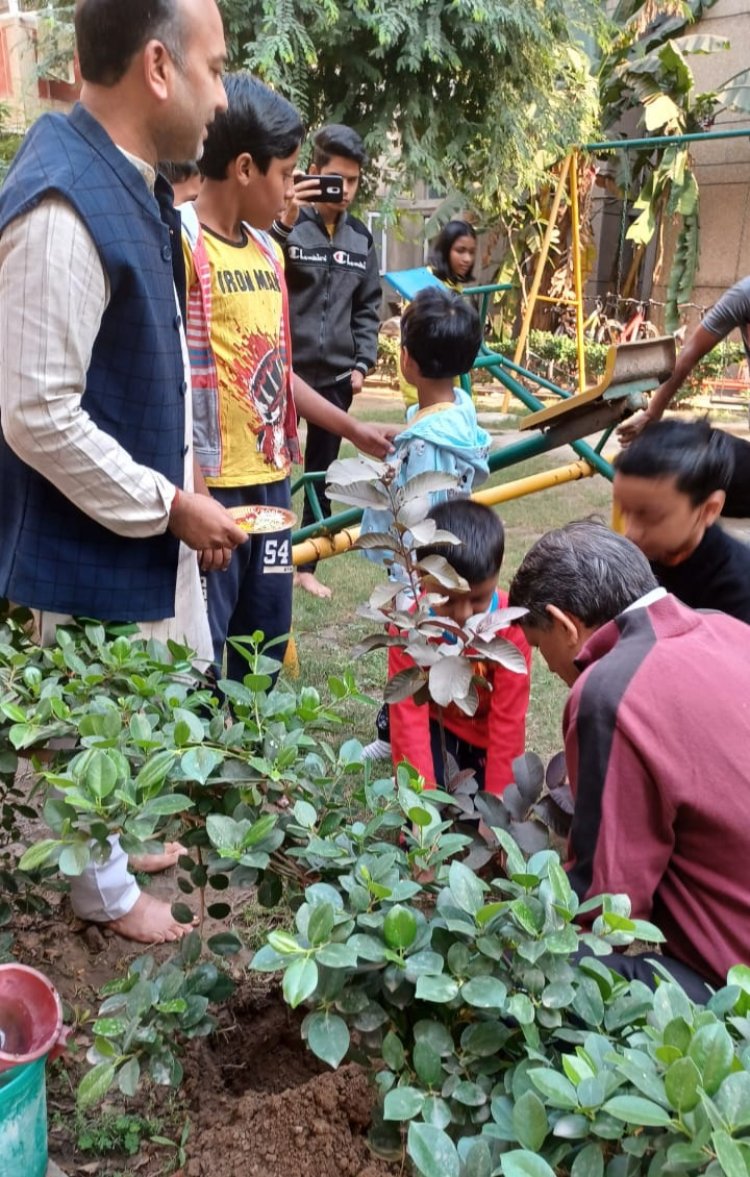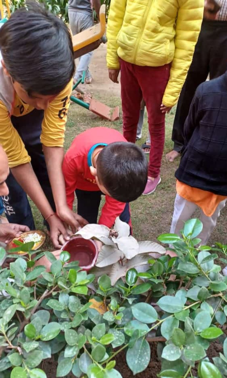 आम और अमरूद के पौधे लगाए। बच्चों ने पौधों की देखभाल करने का भी संकल्प लिया।