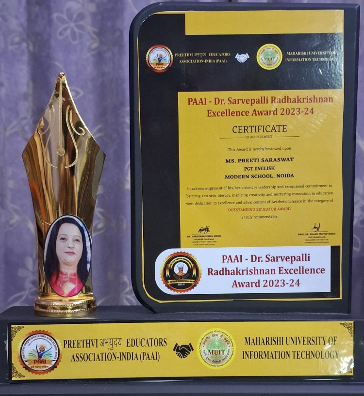 प्रीति सारस्वत 'सर्वपल्ली राधाकृष्णन एक्सीलेंस अवार्ड 2024-25' बेस्ट इंग्लिश टीचर से सम्मानित