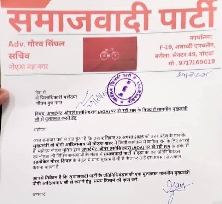 नोएडा। समाजवादी पार्टी के नोएडा महानगर सचिव गौरव सिंघल एडवोकेट के नेतृत्व में सपा के एक प्रतिनिधिमंडल ने अपार्टमेंट ओनर्स एसोसिएशन और शहर की अन्य समस्याओं को लेकर मुख्यमंत्री से मिलने का समय मांगा है ताकि मुख्यमंत्री को शहर की समस्याओं से अवगत कराकर उनका निदान कराया जा सके।