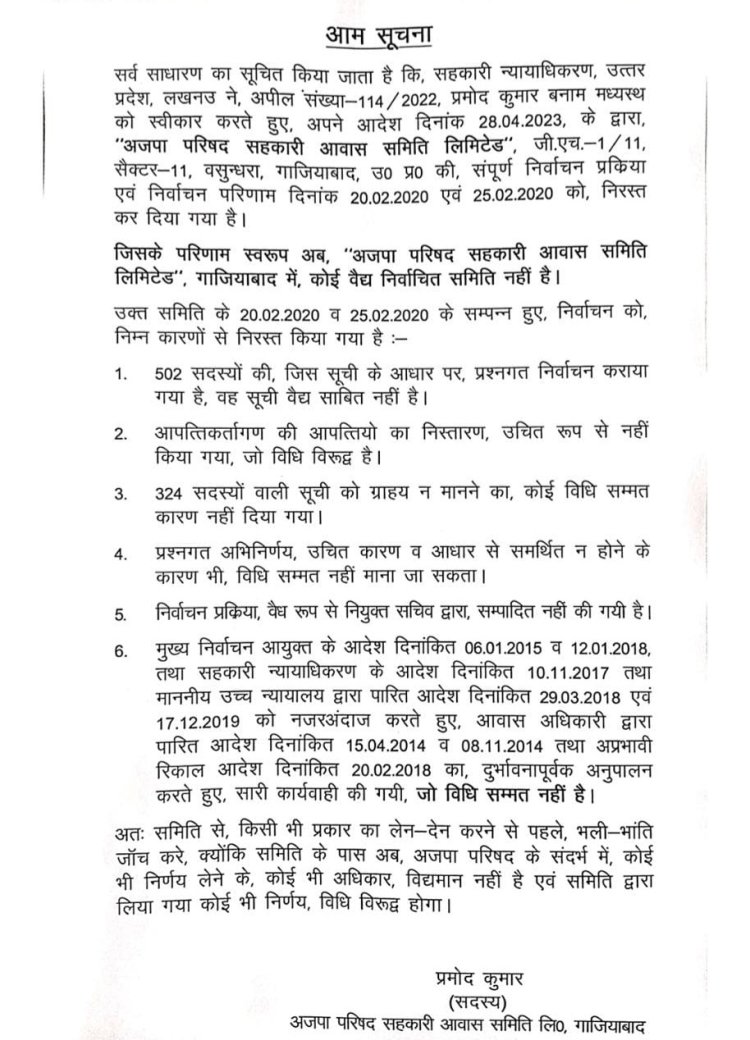 गाजियाबाद। विवादों में रहने वाली अजपा सोसाइटी में बनी समिति को किया गया रद्द। आपको बता दें कि अजपा परिषद सहकारी आवास समिति के द्वारा यह फैसला लिया गया है कि सोसाइटी में चल रही समिति को निरस्त किया जाता है।