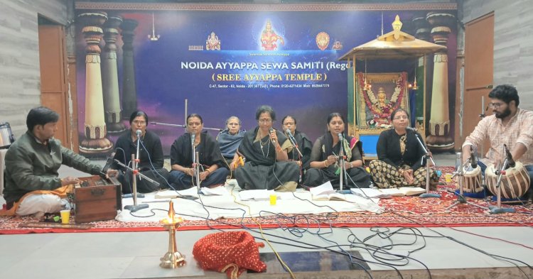 नोएडा। सेक्टर 62 स्थित श्री अय्यप्पा मंदिर में एक अत्यंत भक्तिमय एवं सांस्कृतिक वातावरण देखने को मिला, इस अवसर पर गुरु मारी एलंगोवन के मार्गदर्शन में लेडीज़ विंग, नोएडा अय्यप्पा सेवा समिति द्वारा प्रस्तुत भजन संध्या ने उपस्थित श्रद्धालुओं को मंत्रमुग्ध कर दिया। भावपूर्ण गायन, शास्त्रीय रागों की मधुर प्रस्तुति और समर्पित भाव ने संपूर्ण मंदिर परिसर को आध्यात्मिक ऊर्जा से भर दिया।