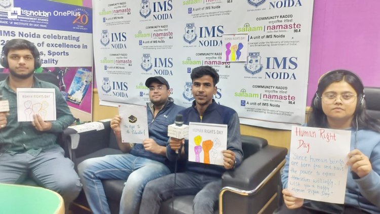 नोएडा। आईएमएस नोएडा के सामुदायिक रेडियो सलाम नमस्ते में मानवाधिकार दिवस पर कार्यक्रम का आयोजन हुआ। कार्यक्रम के दौरान संस्थान के छात्रों ने मानवाधिकारों के महत्व पर विचार-विमर्श किया। वहीं छात्रों ने शिक्षा, लैंगिक समानता, और स्वतंत्रता के अधिकार विषय पर अपने विचार प्रकट किए।