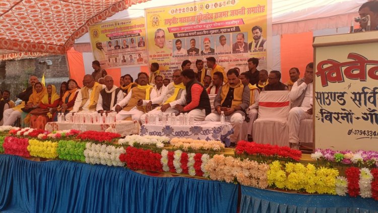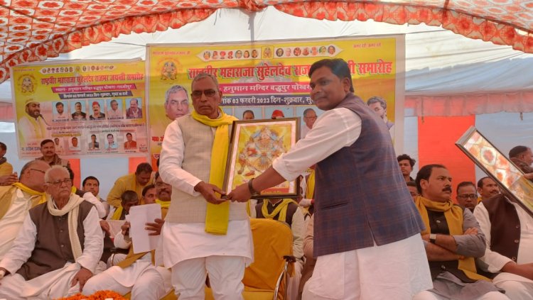 गाजीपुर बिरनो -राष्ट्रवीर महाराजा सुहेलदेव की जयंती शुक्रवार को बद्धुपुर पोखरा स्थित हनुमान मंदिर पर मनाया गया। कार्यक्रम के मुख्य अतिथि सुभासपा के राष्ट्रीय अध्यक्ष एवं वर्तमान विधायक जहुराबाद रहे। कार्यक्रम की अध्यक्षता मुसाफिर राजभर एवं संचालन आकाश राजभर ने किया कार्यक्रम की शुरुआत मुख्य अतिथि ओमप्रकाश राजभर ने महाराजा सुहेलदेव के चित्र पर पुष्प अर्पित कर किया। सभा को संबोधित करते हुए कहा कि महाराजा सुहेलदेव के बताए हुए रास्ते पर चलकर हमें समाज को एकजुट करना है वह उनके आदर्शों को